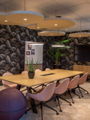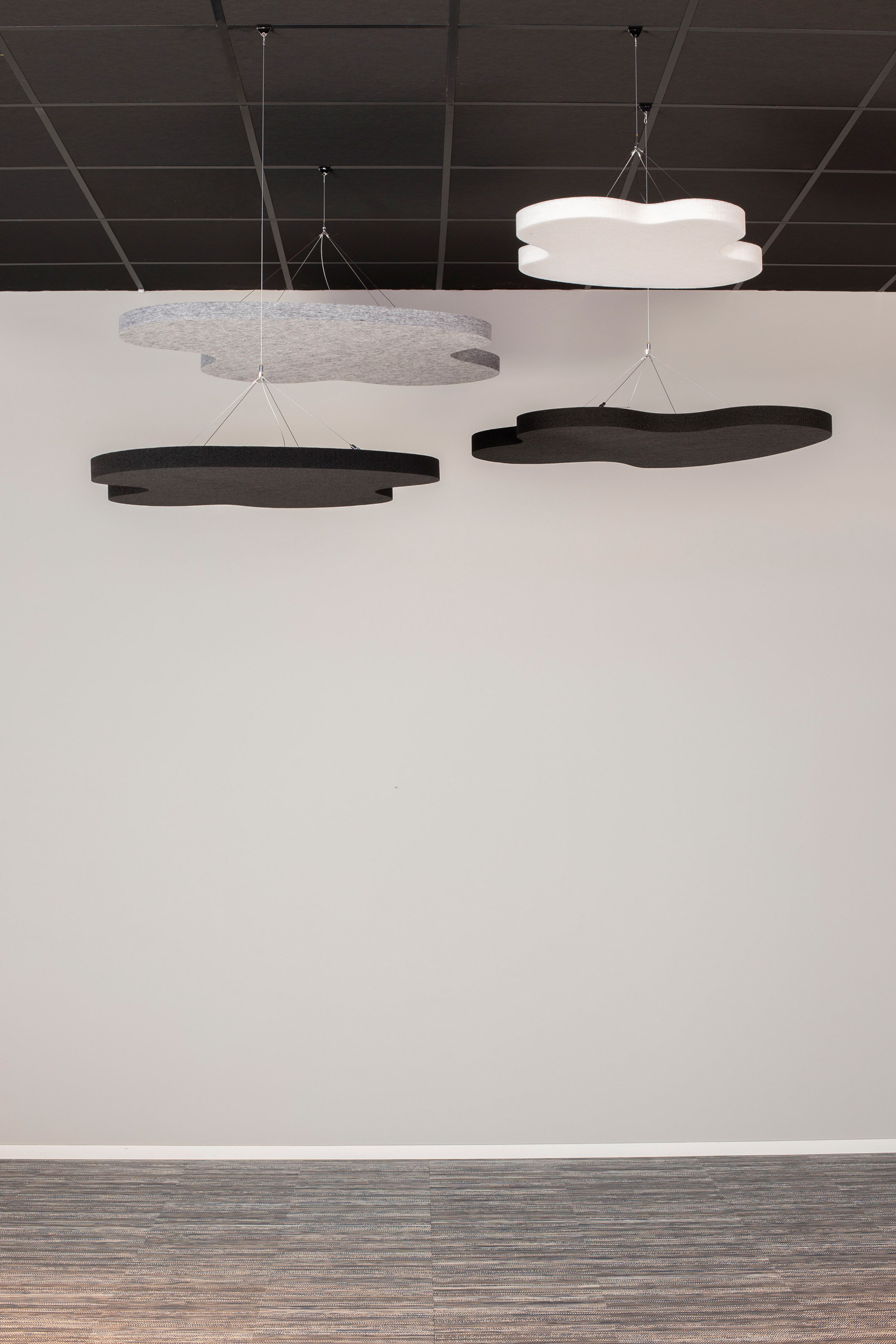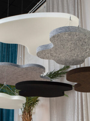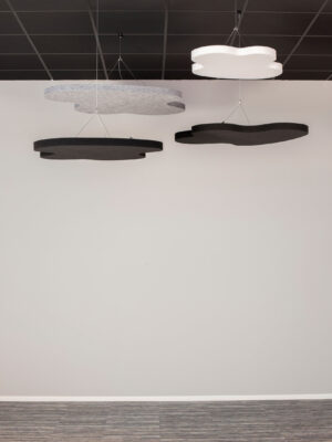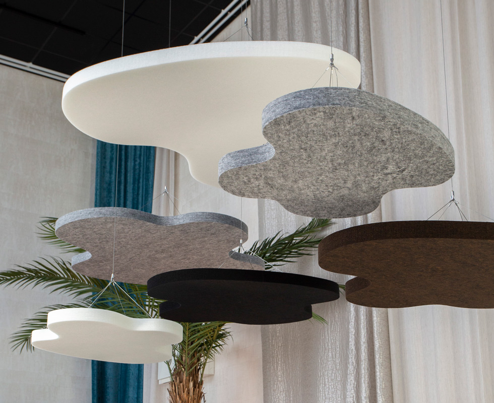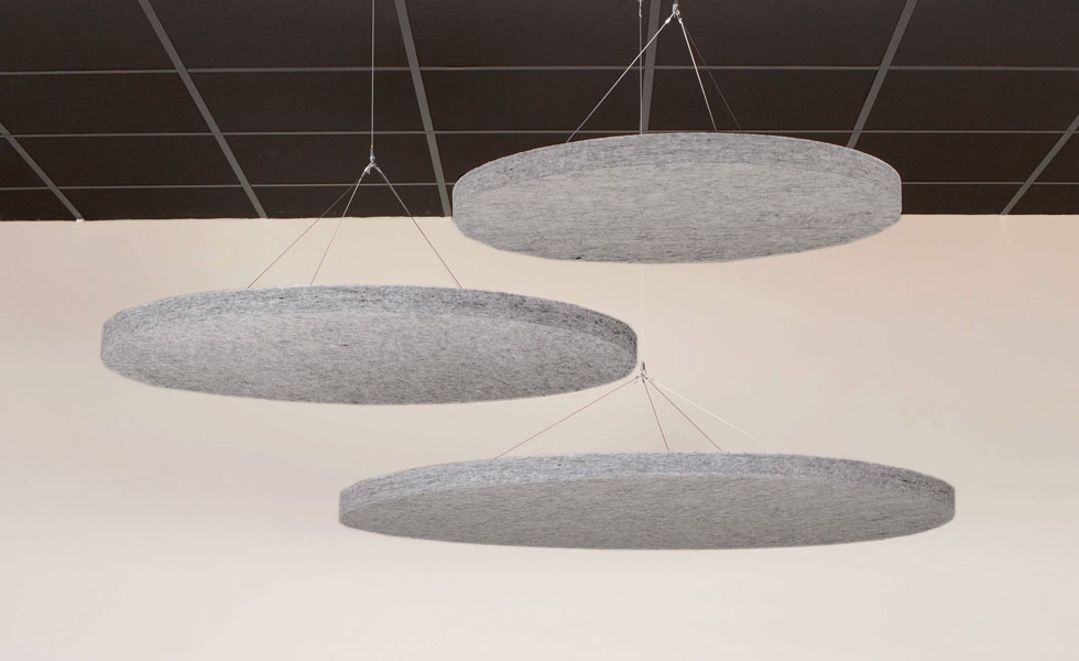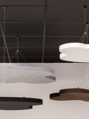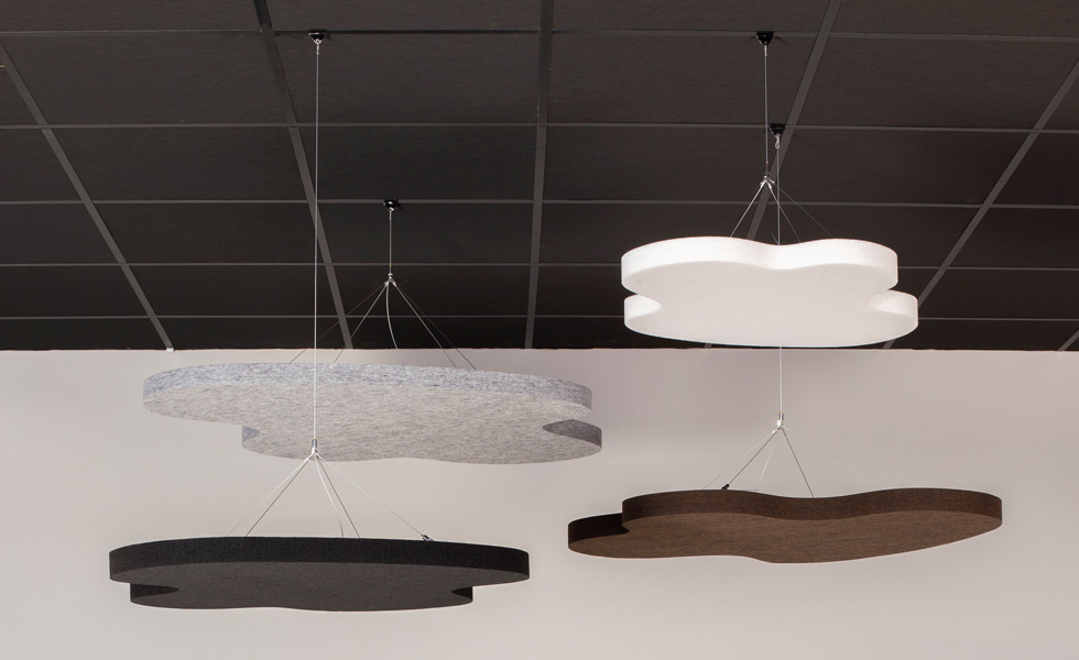 SOUND OFF Deckenabsorber sind mit oder ohne Textilien erhältlich. Ausführungen mit Textil haben eine gerade Schnittkante und das Kernmaterial ist von der Seite sichtbar. Mit der LED-Lampe trägt SOUND OFF zu einer effektiven Beleuchtung in jedem Raum bei. SOUND OFF ist ein effektiver Schallabsorber aus EcoSUND, das aus recyceltem PET besteht.