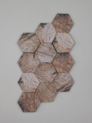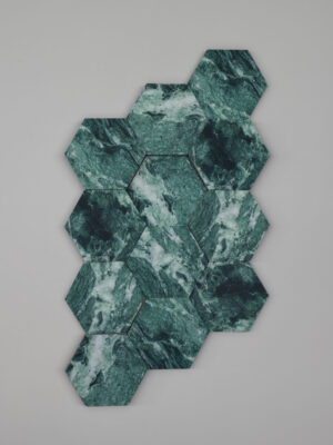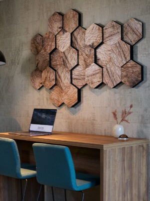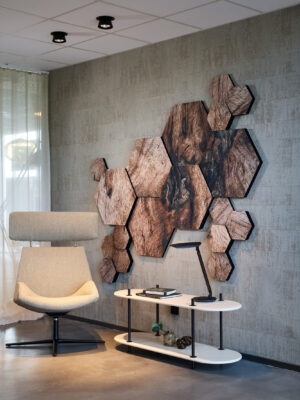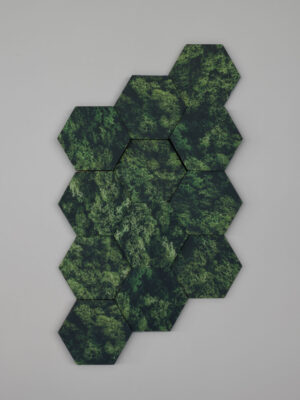 HONEY PRINT MINI, like its big brother HONEY PRINT, is a playful and modular wall absorber with panels that can be arranged to form unique patterns in different colors, with or without fabric. It has a three-dimensional look thanks to the varying thicknesses of the absorbers. It can be used together with HONEY PRINT or entirely on its own. HONEY PRINT MINI is an effective sound absorber made from EcoSUND®, which consists of recycled PET.