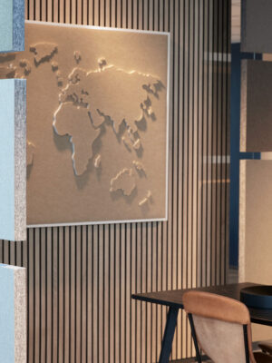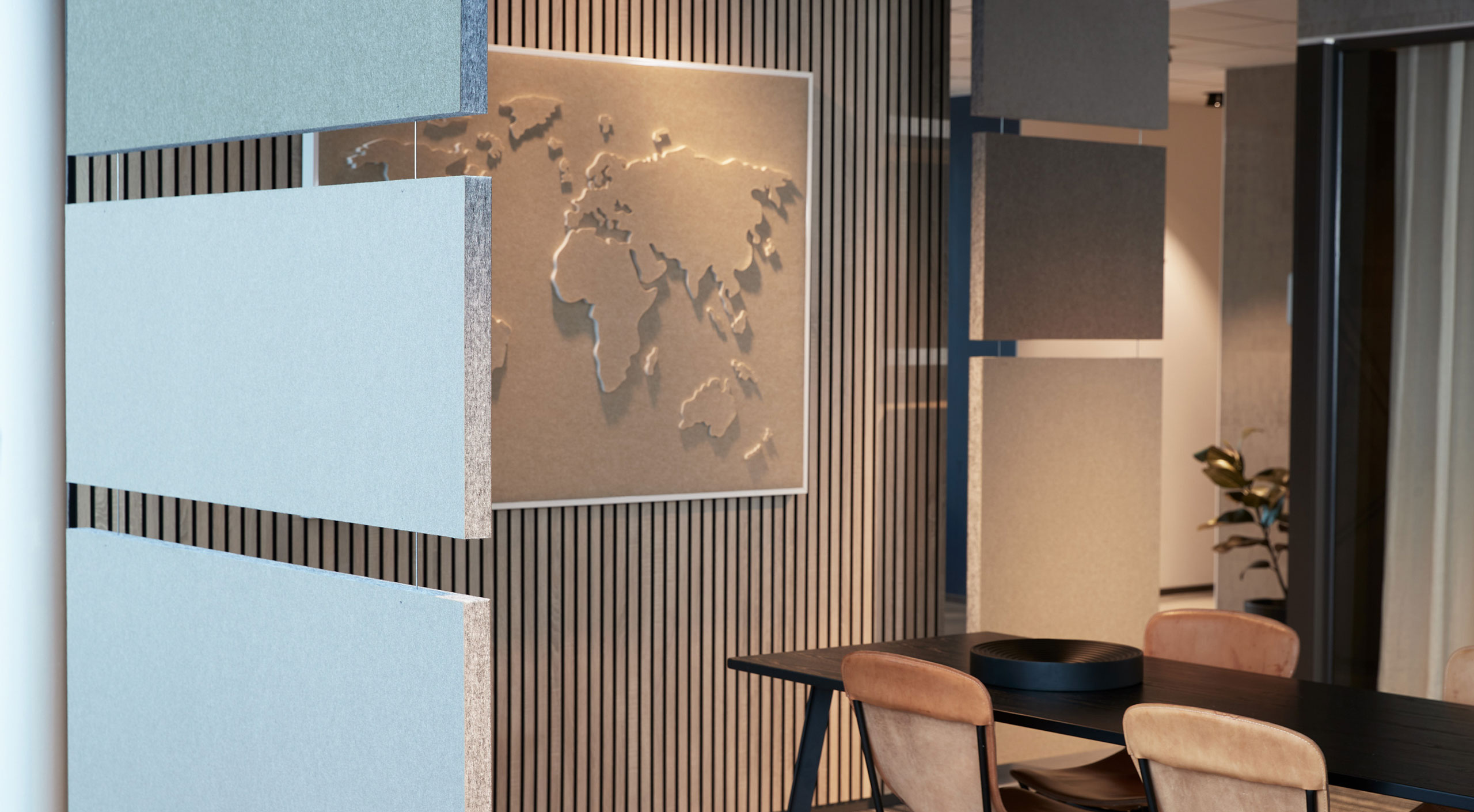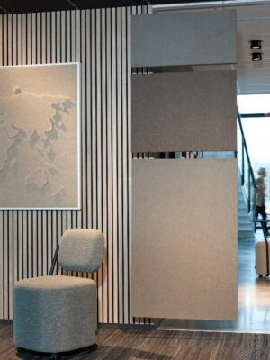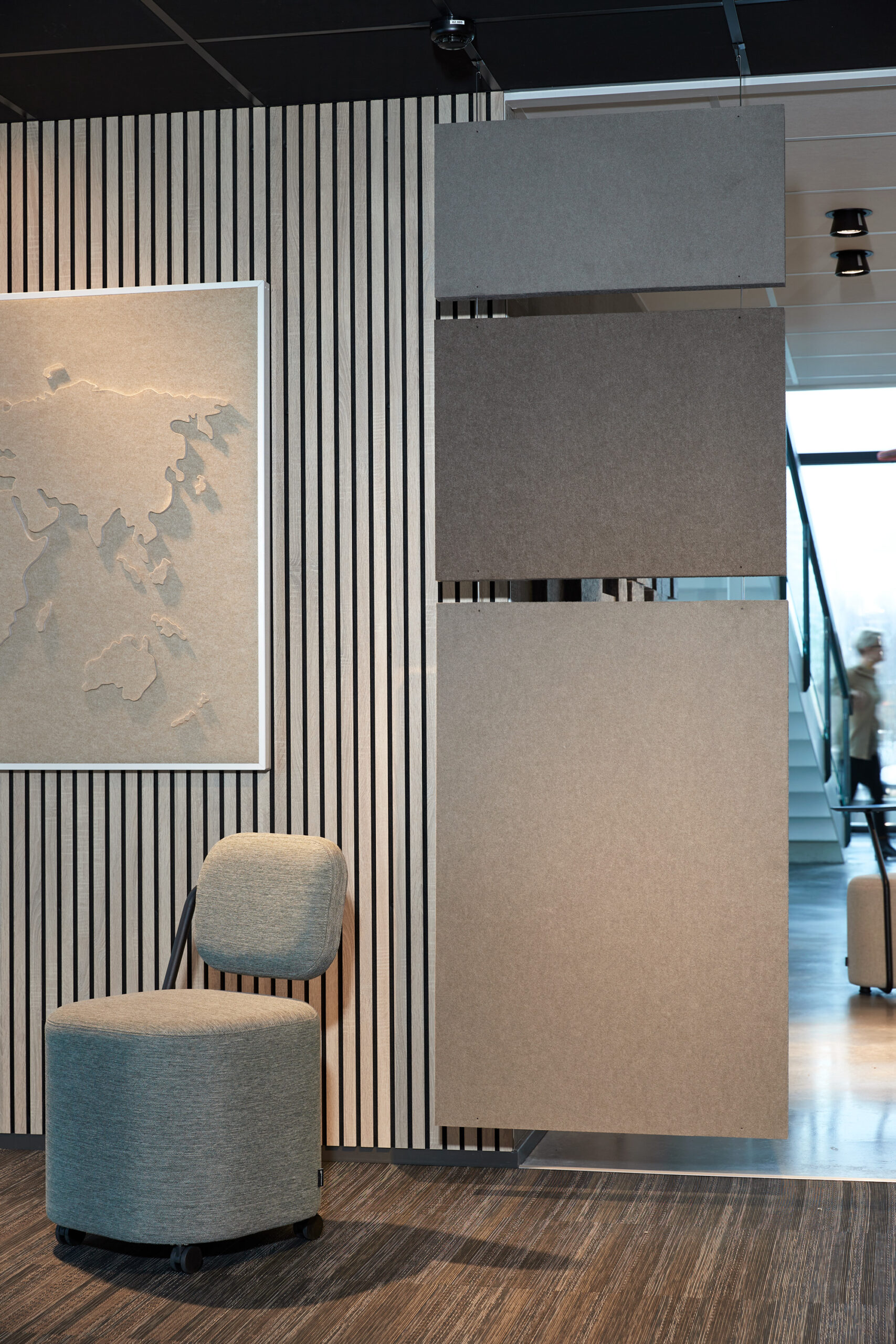 PENDULA iSQUARE s an efficient sound absorber manufactured by EcoSUND consis-ting of recycled PET. The absorbent is often used to create space in the room or as baffles in the ceiling to prevent sound propagation. PENDULA Vertical Absorbent is mounted piece by piece and does not interfere with existing installations such as ventilation and lamps, which makes it even more affordable as craftsmen do not have to move already mounted products. Suspension is added.