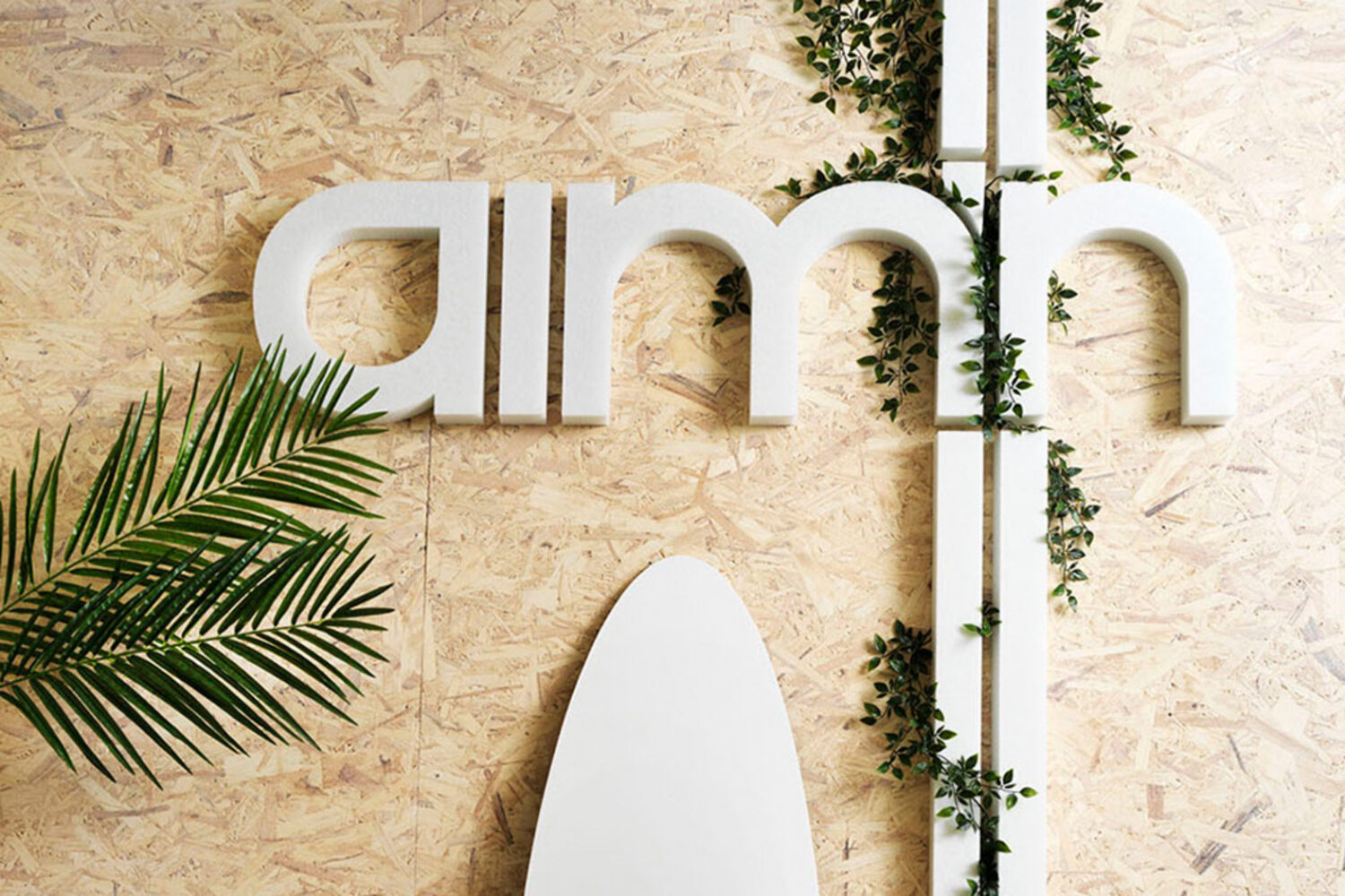 The OSB panel wall bears their logo: large, rounded lowercase letters where one of the legs of the M and one of the legs of the N run down in parallel and continue out onto the floor. This stripe has become Aim’n’s most visible trademark and has also been copied by other brands. But none of them have had the idea of putting the logo on sound absorbents, that much is for certain. Except for Aim’n.