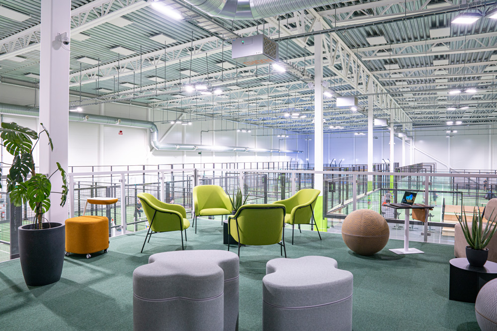 The lighting meets the highest international standards. It has a high lux count and is designed especially for sports, with opti-mised light distribution and minimal glare. The lighting is also important given the high ceiling, as the balls need to stay out of the shadows even after high shots.