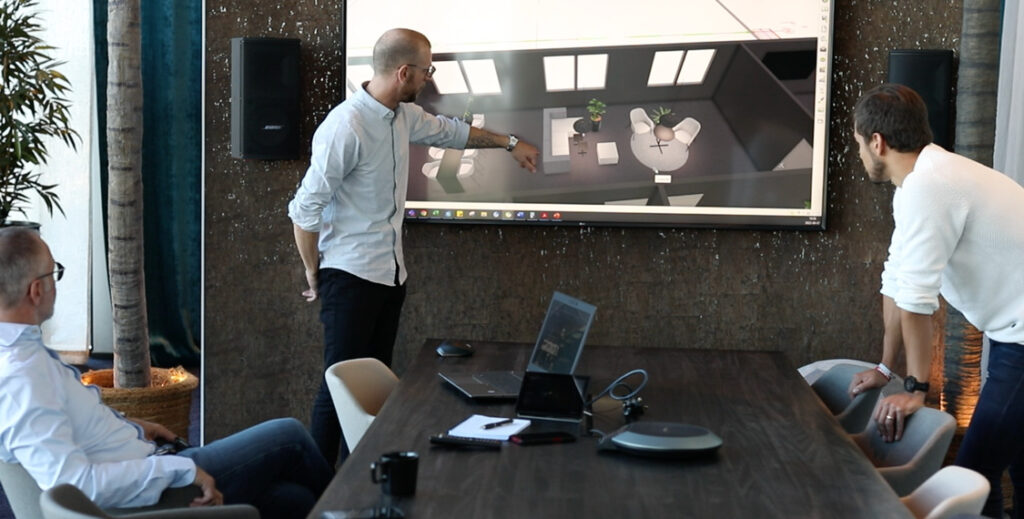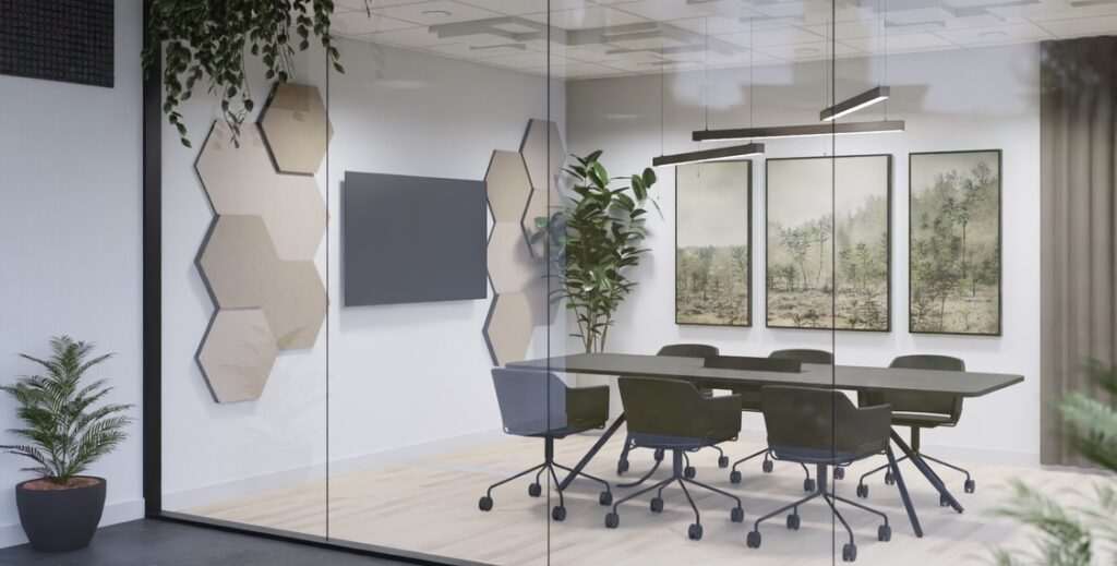 Flexibelt förslag. Vi presenterar en 3D- ritning där vi tillsammans kan byta produkter och ändra i realtid. Våra förslag grundar sig alltid i nogranna akustikberäkningar för att ljudmiljön ska bli så behaglig som möjligt. Läs mer om akustik här.