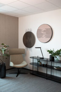 LASI är likt sin systerprodukt LINK designat för att kunna vara i en solitär design eller fler som tillsammans skapar mönster på tak eller vägg. De raka trådarna håller sig inom den runda ramen och tillsammans skapar en fin kontrast. Genom att variera trådriktningen blir det mer abstrakt. Trådarnas design är inspirerade av ljudvågorna de ska ta upp. LASI blir komplett när den adderas med Off the Grid Cirkelabsorbent i klädd eller rå EcoSUND 750 mm.