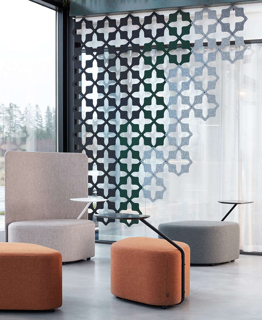 COBOGO unterteilt offene Räume und schafft mehr Platz im Raum. Vertikale Hängepaneele für Decken aus extrudiertem Filz, der zu mindestens 55 % aus recyceltem PET besteht. Dicke: 5 mm. Als Raumteiler wird COBOGO oft näher an der Lärmquelle platziert und kann früh auftretende Schallwellen absorbieren.