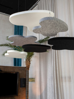 SOUND OFF CLOUD är en modulär takabsorbent med paneler med eller utan textil.