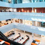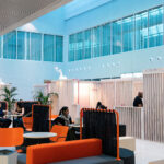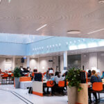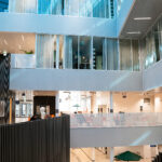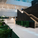 – Vårt nära samarbete med Cedervall Arkitekter, Akustikmiljö och Flexplåt resulterade delvis i ljudabsorbenter bakom de ribbade träpanelerna vid entréerna som Jörgen berättar om, men även cirka 2 500 m2 plåtbeklädda akustikväggar för att skapa en lugn och trivsam universitetsmiljö.