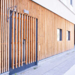 – Fasaderna har en vertikal indelning med våningshöga fält som är omväxlande täta med ljusgrå puts och omväxlande öppna med glasytor och paneler av varmförzinkad plåt. Varje våningsplan har sin egen rytm som samspelar med de andra planen. Vid entréer och platser där man kommer nära byggnaderna är fasadgestaltningen mjukare och varmare med ribbverk av trä. Väggarna med träribbor fortsätter även in i byggnaderna vid entréerna och binder på så sätt samman den yttre och den inre miljön, berättar Jörgen.