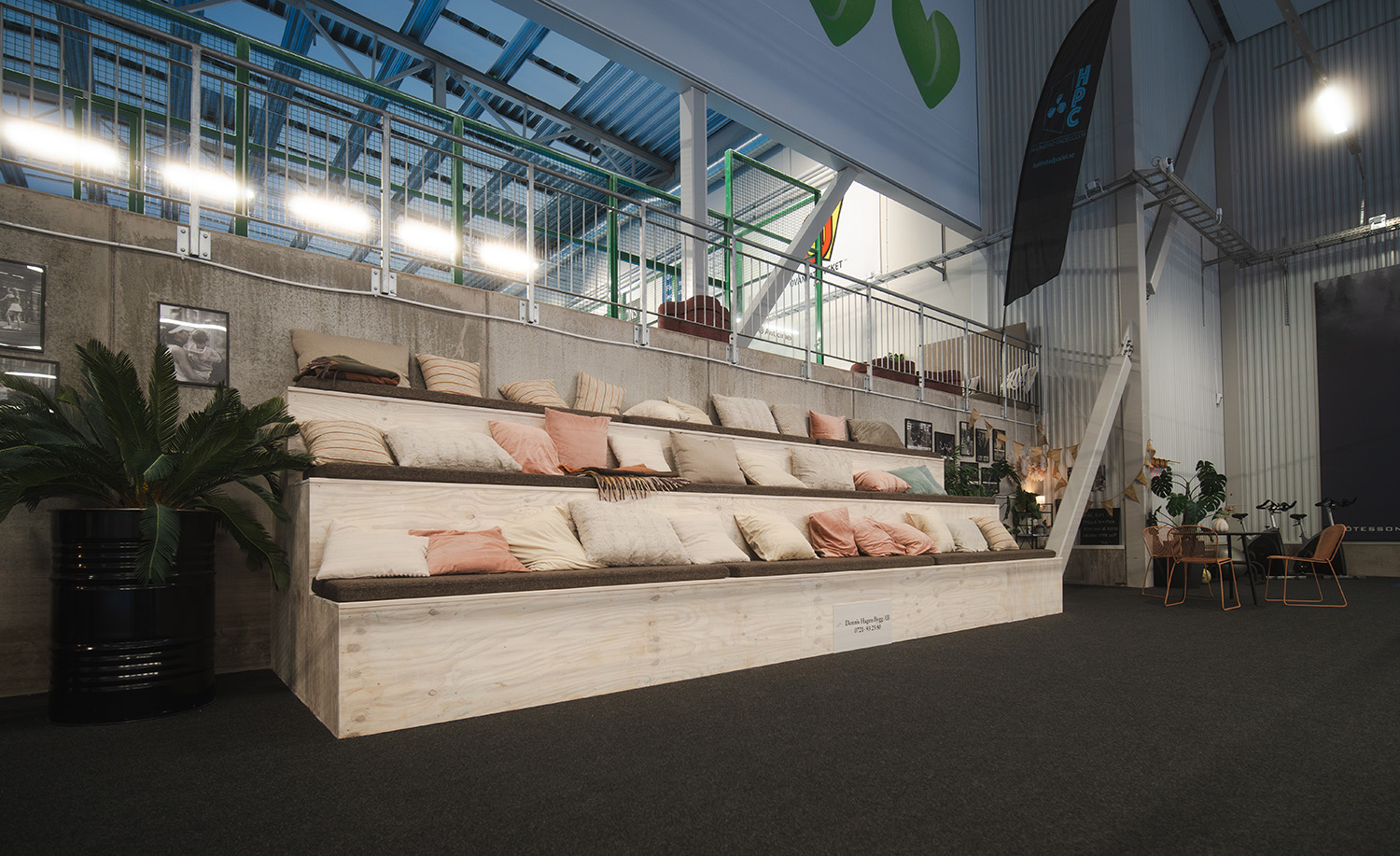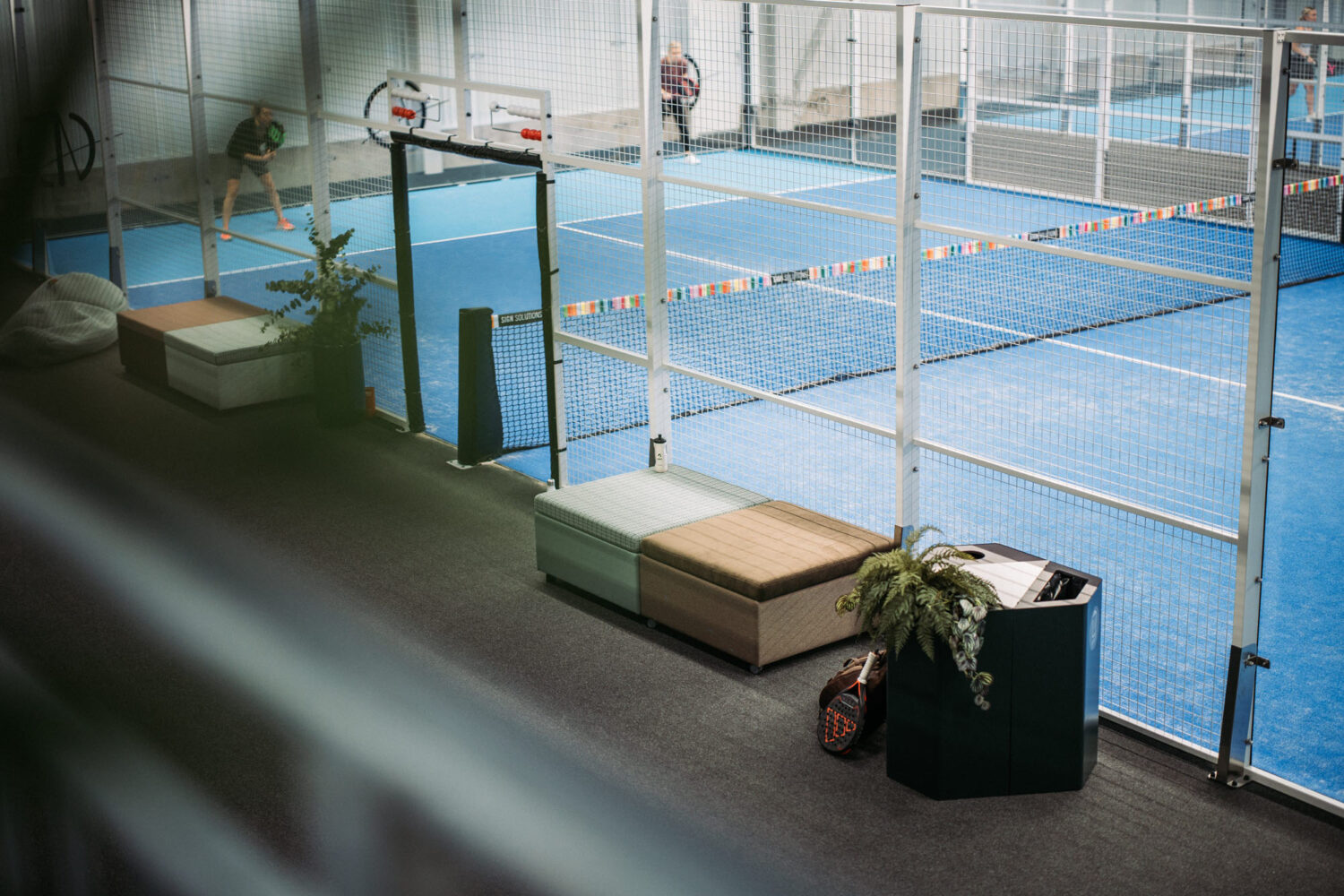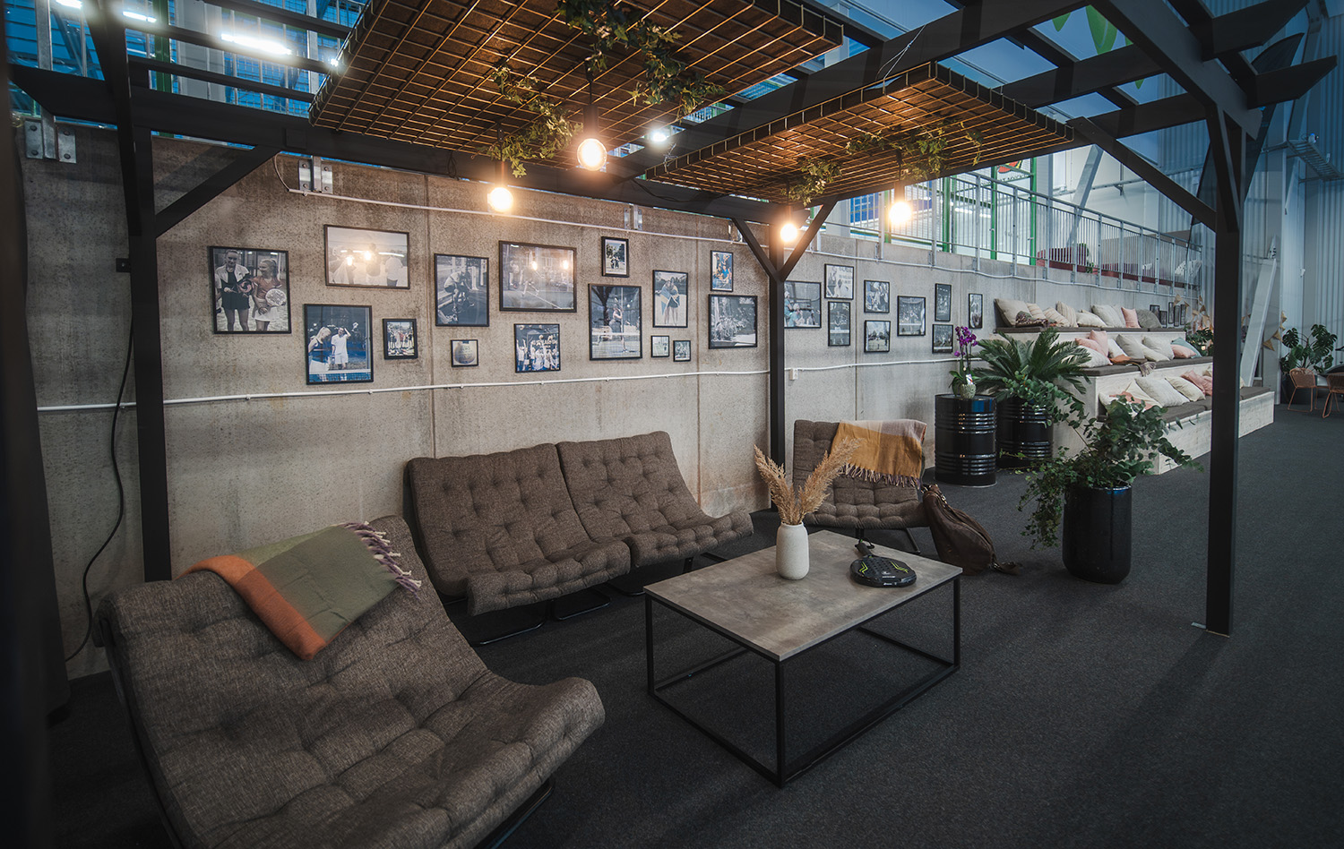 Satsningen har inte stannat vid själva spelplanerna. Även flera av biytorna har fått nytt liv, bland annat området runt centercourten i padelhallen. Här har man skapat en trivsam miljö med sittmöbler, puffar och växter – samtliga produkter är 100 procent återbrukade och bidrar till både komfort och hållbarhet.